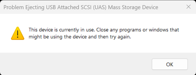 The solution is to go to Event Viewer and find the offending software which is blocking the ejection.